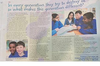 “In every generation they try to destroy us…” is the headline followed by pictures of serene, joyful children…